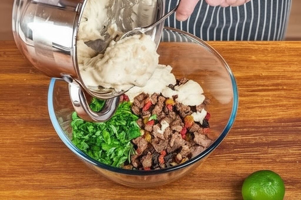 Posiekaj kolendrę, wyciśnij sok z limonki. W dużej misce zmieszaj wołowinę, beszamel, kolendrę oraz sok z limonki. Masa powinna być dosyć gęsta i lepka. Umieść całość w płaskim naczyniu i wstaw do lodówki, aż porządnie ostygnie i zgęstnieje.