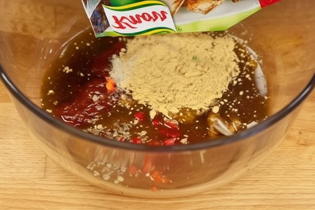 Zawartość paczki Knorr połącz z Ketchupem Hellmann's Pikantnym, miodem i colą. Wsyp posiekane chili, roztarte w moździerzu nasiona kolendry, roztarty czosnek i kumin.