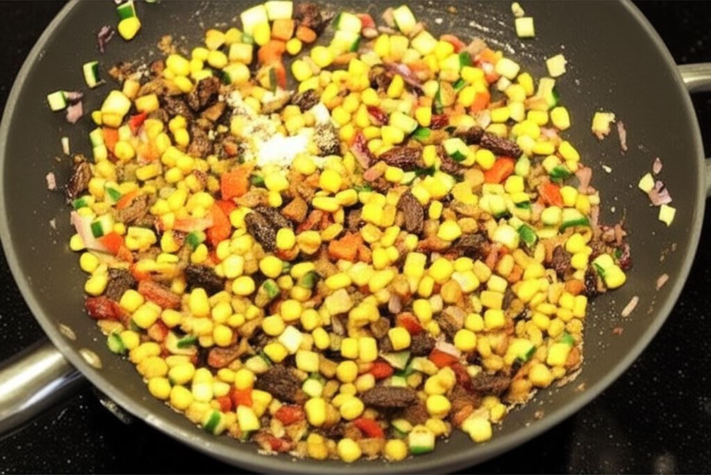 Cukinię i czerwoną cebulę pokrój w małą kostkę. Posiekaj kolendrę. Na rozgrzanej patelni zesmaż cebulę, następnie dodaj cukinię oraz fasolę i kukurydzę z puszki. Wsyp kolendrę i dopraw do smaku przyprawą czosnek Knorr. Całość wymieszaj.