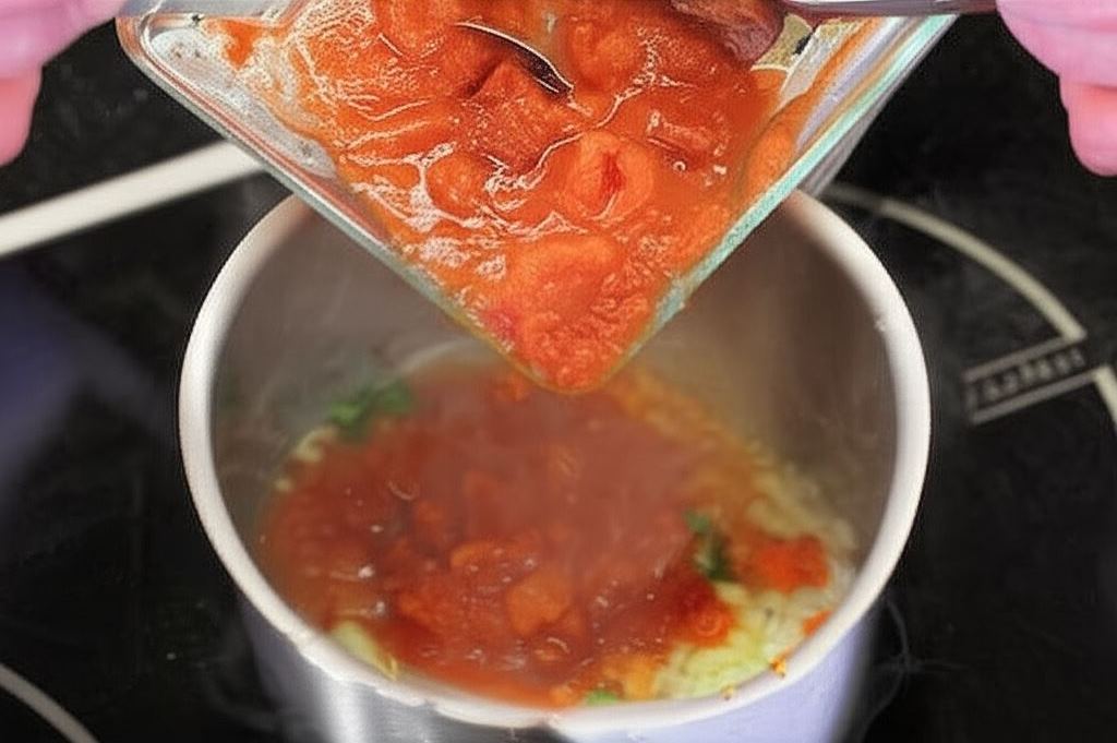 Przygotuj sos: w rondelku, na rozgrzanej oliwie, zrumień pokrojoną w kostkę cebulę, wsyp rozdrobnione pomidory z puszki, dorzuć posiekaną papryczkę chilli oraz łyżkę siekanej kolendry. Doprowadź do wrzenia.