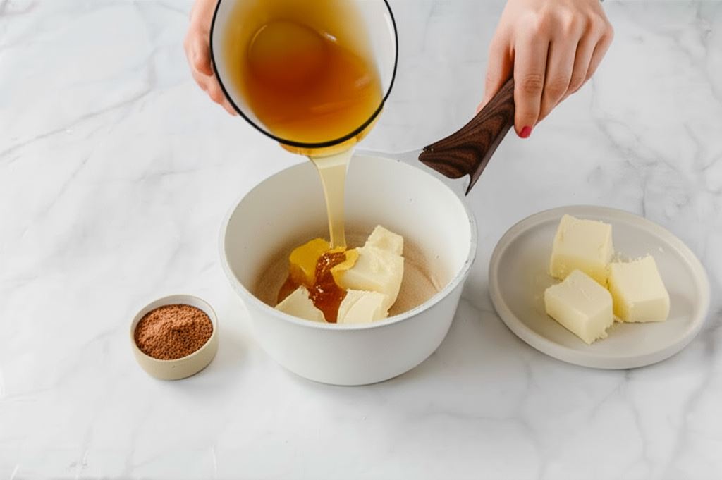 Do garnka przekładamy masło, dodajemy miód oraz przyprawę do piernika. Podgrzewamy aż składniki się rozpuszczą. Odstawiamy do ostygnięcia.