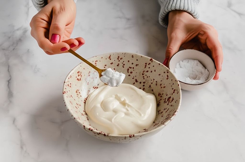 Do oddzielnej miski przekładamy śmietanę. Dodajemy sodę, mieszamy i odstawiamy do napęcznienia.