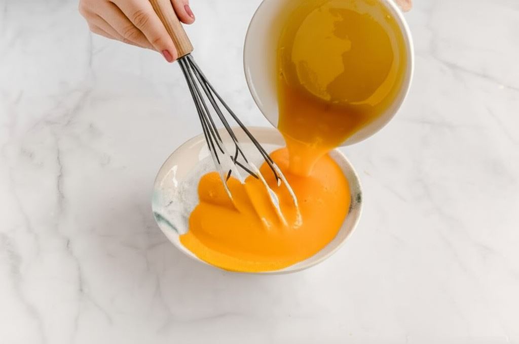 W oddzielnej misce ubijamy 2 białka z odrobiną soli. Potem wsypujemy cukier i kontynuujemy ubijanie, aż piana stanie się błyszcząca i sztywna. Na końcu dodajemy 4 żółtka i znowu miksujemy.