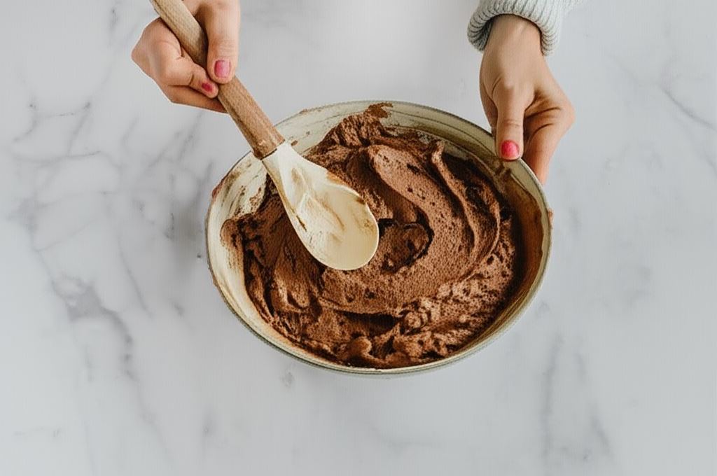 Ubitą pianę łączymy z mąką i kakao. Potem dodajemy wystudzone masło z miodem i przyprawą do piernika oraz śmietanę z sodą. Wszystko wyrabiamy, dopóki nie uzyskamy gładkiego, lecz dość rzadkiego ciasta. Okrywamy je folią aluminiową i wstawiamy na 24 h do lodówki.