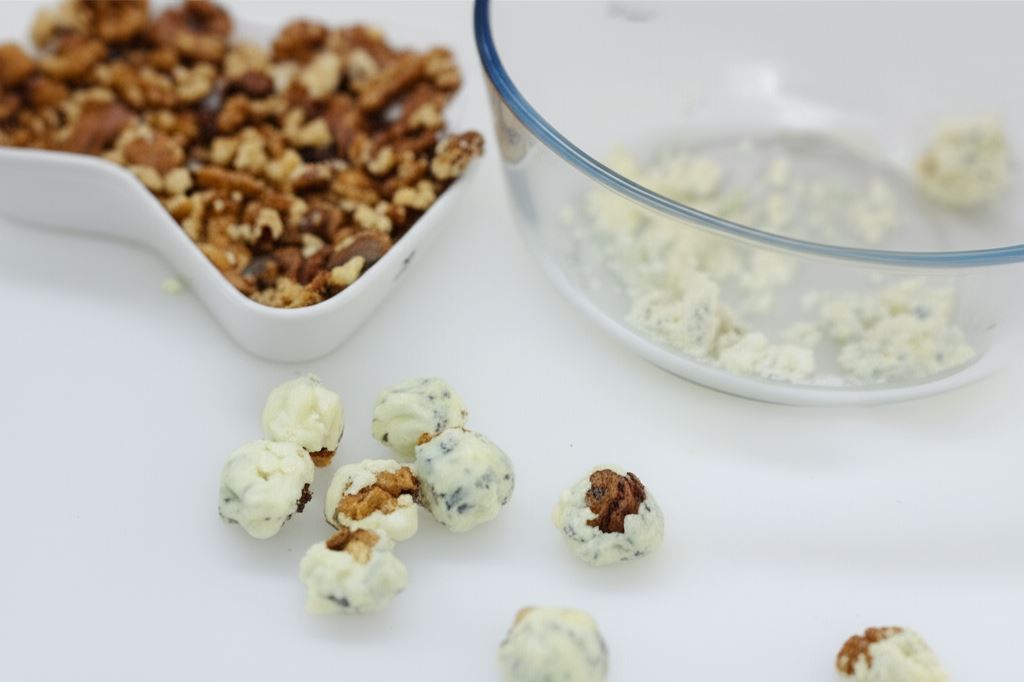 Rozetrzyj ser w dłoni, uformuj z niego niewielkie kuleczki i połącz je z fragmentem włoskiego orzecha.
