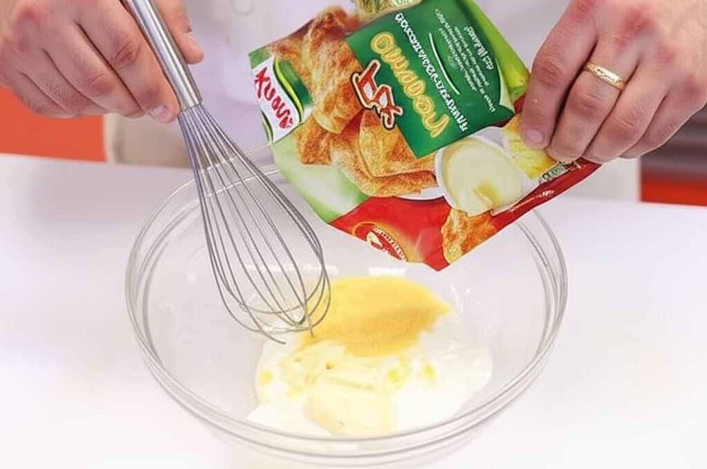 Sporządź dip, łącząc majonez i jogurt z zawartością sosu sałatkowego Knorr. Mięsne kuleczki serwuj zanurzone w dipie serowym.