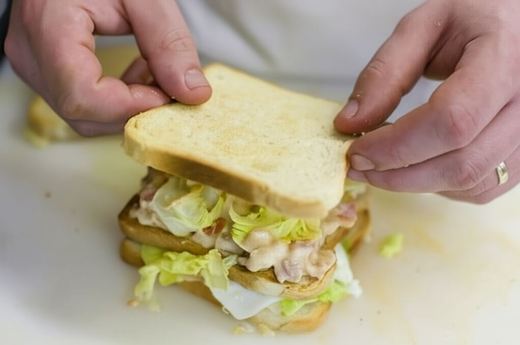 Na przygotowany tost nałóż sos z warzywami i krewetkami, garść posiekanej sałaty i jajko. Wszystko nakryj drugą kromką, znów ułóż warstwę warzyw oraz sałaty (bez jajka) i nakryj trzecim tostem. Operację powtórz z pozostałymi trzema tostami, powinny wyjść dwie kanapki.