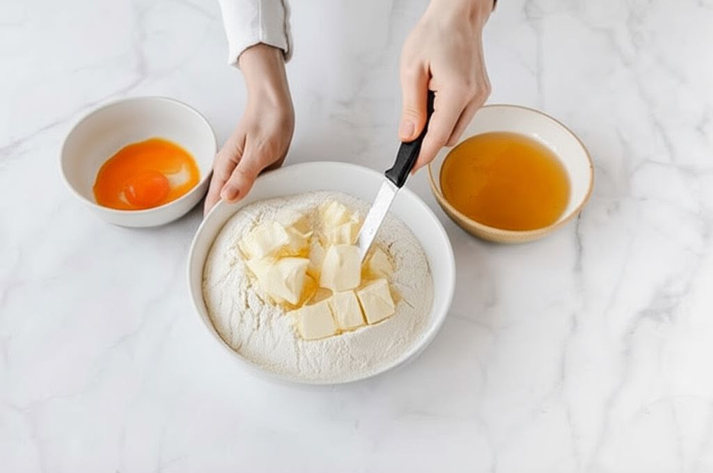 Przesiewamy mąkę do miski. Dodajemy zimne masło pokrojone w kostkę.