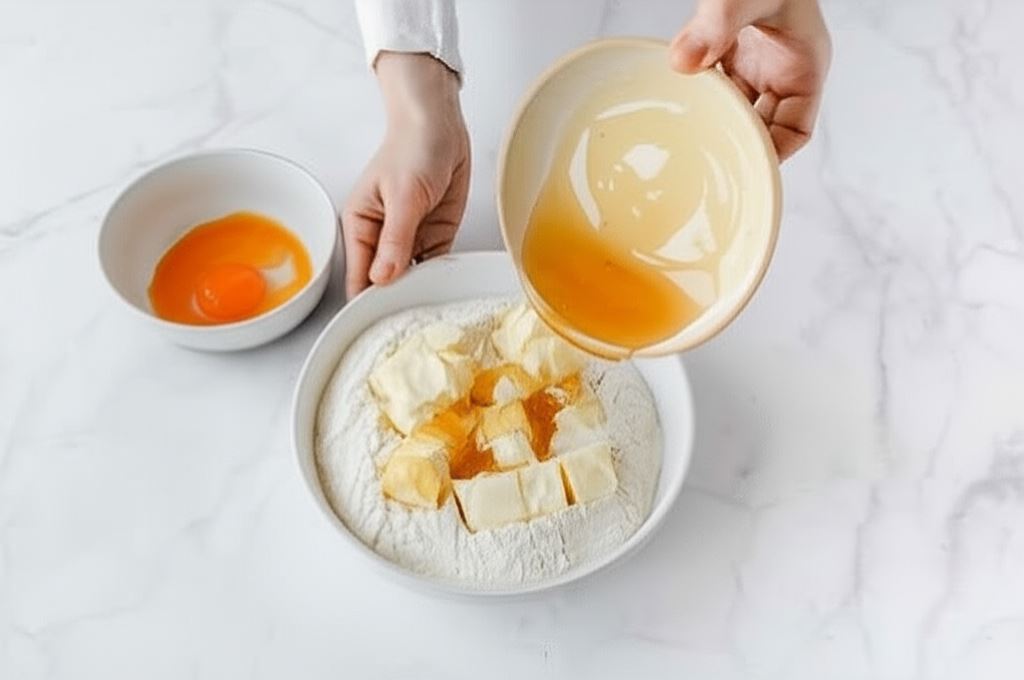Potem wlewamy miód, wsypujemy żółtka i wyrabiamy na jednolite ciasto.