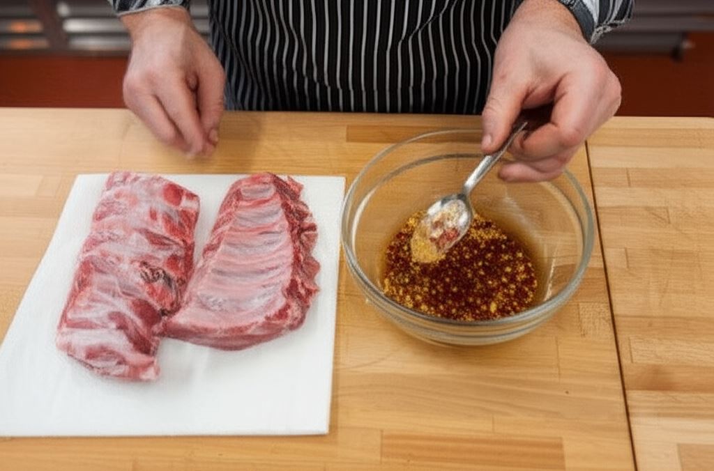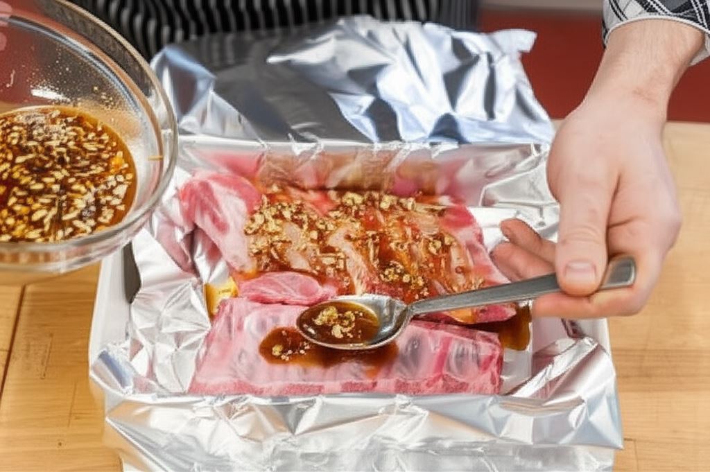 Przygotowaną marynatą natrzyj żeberka, owiń folią i odstaw do lodówki na 1-2 godziny.