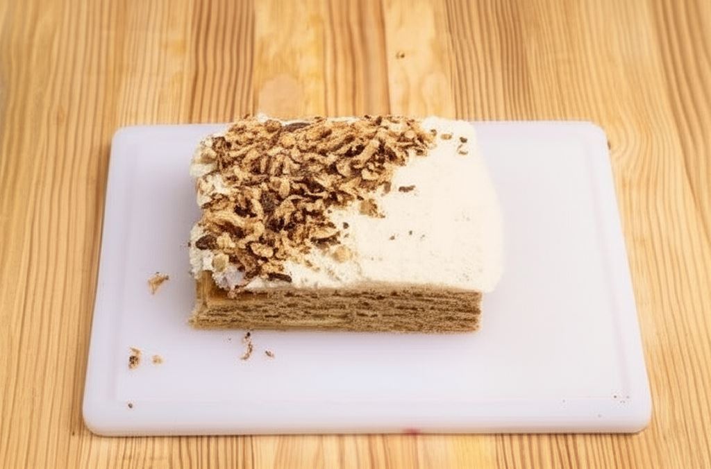 Ciasto miodowe pieczone jest na cienkie placki, które po upieczeniu nabierają korzennego aromatu. Krem z kaszy manny stanowi idealne dopełnienie – jest delikatny, kremowy i doskonale komponuje się z miodowymi warstwami. Całość posypana prażonymi orzechami tworzy harmonijną kompozycję smaków, która rozpływa się w ustach.