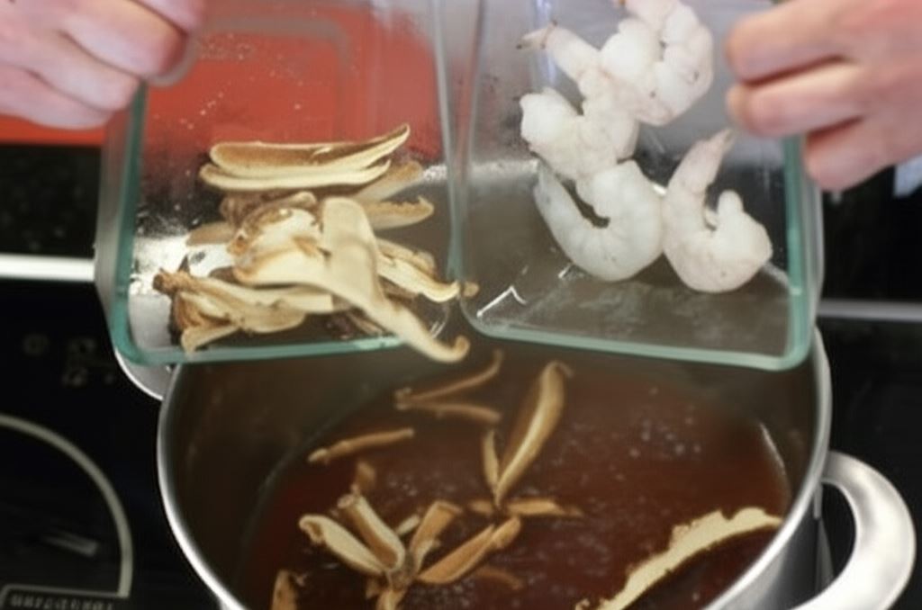 W rozgrzanym wywarze blanszuj, przez około 1 minutę, oczyszczone krewetki i pocięte w paski grzyby shitake oraz fragmenty cebuli dymki.