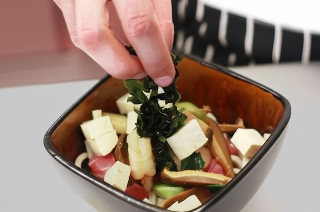 Na dnie miseczek umieść wcześniej ugotowany makaron, tuńczyka pokrojonego w kostkę, krewetki, paski grzybów shitake, kawałki tofu pokrojone w kostkę, wcześniej namoczone glony wakame, kawałki cebuli dymki, wraz ze szczypiorem pociętym na kawałki o długości trzech centymetrów.