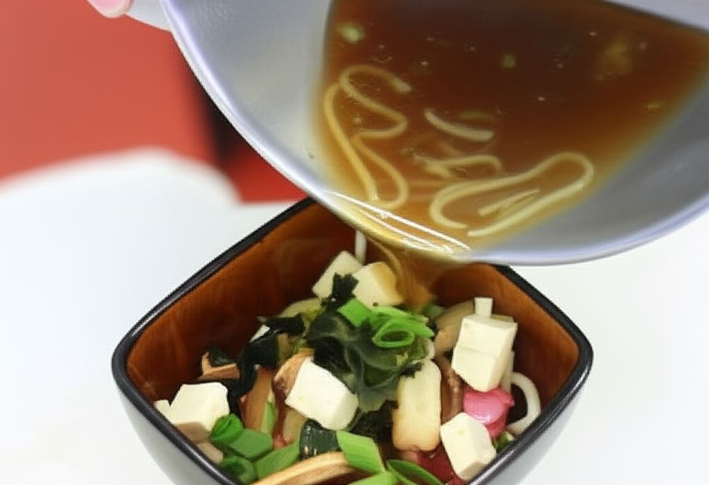 Do wywaru dashi wlej szklankę wody i pastę miso. Zagotować.