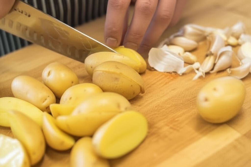 Ziemniaki starannie umyj, przetnij na połowy lub ćwiartki, jeśli są duże. Czosnek rozdziel na ząbki, nie obieraj z łupin.