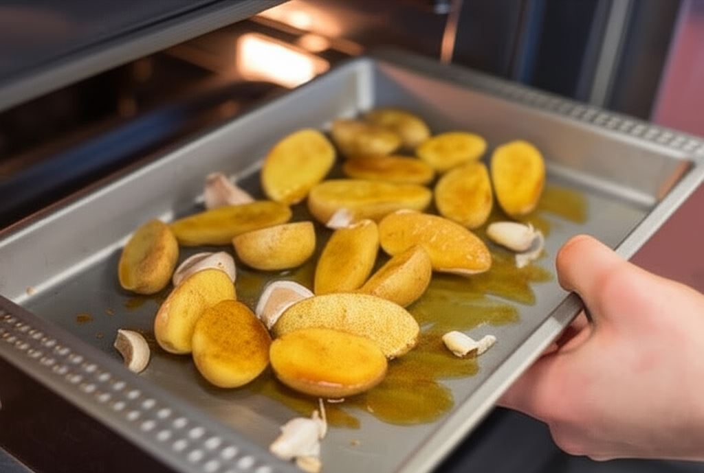 Olej połącz z kminem, kurkumą, chili i solą, posmaruj mieszanką ziemniaki i umieść na blasze, dodając ząbki czosnku.