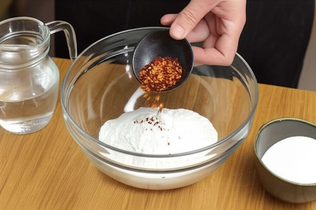 W misce wymieszaj mąkę ryżową z cukrem i przyprawą Knorr, potem wlej wodę i starannie połącz wszystko.