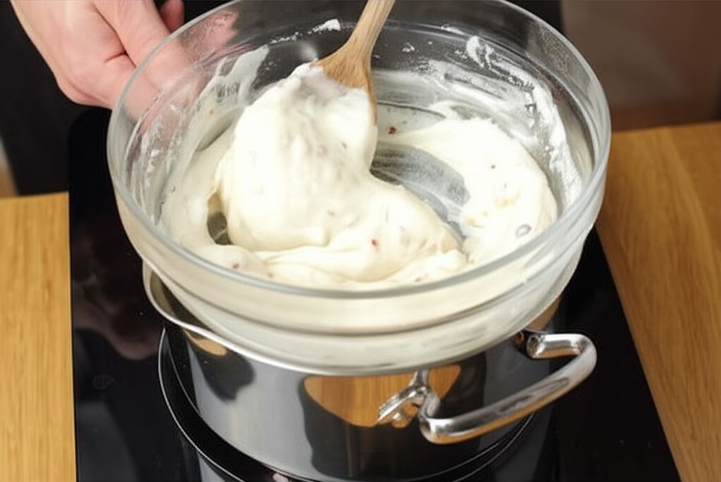 Naczynie z ciastem włóż do kąpieli wodnej na 15 min, mieszając od czasu do czasu, aż konsystencja ciasta stanie się gęstsza.