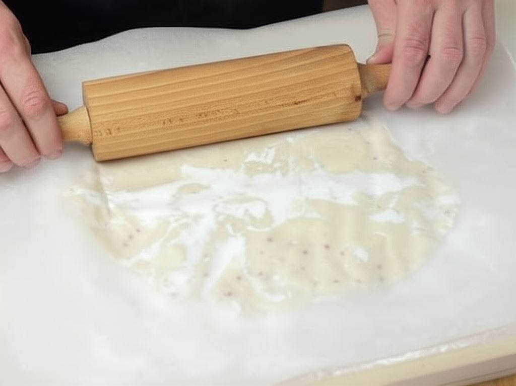 Na stolnicę połóż pergamin i posyp obficie mąką ziemniaczaną. Na tak przygotowaną powierzchnię wyłóż ciasto, posyp resztą mąki, nakryj drugim pergaminem i rozwałkuj na grubość 2 mm. Rozwałkowane ciasto razem z pergaminem włóż do lodówki na 15 min do schłodzenia.