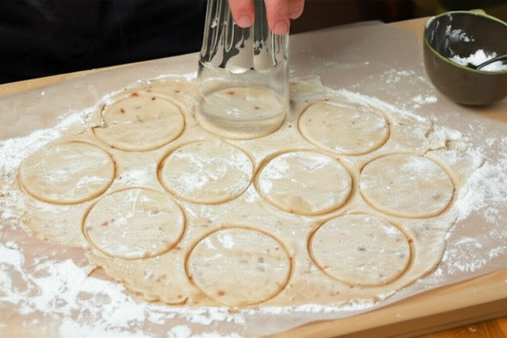 Wychłodzone ciasto oczyść pędzelkiem z nadmiaru mąki i wykrój w nim szklanką koła.