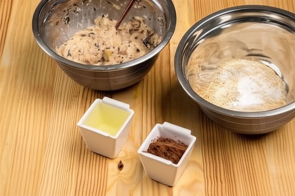 Wsyp mąkę pszenną, migdałową, sodę, kakao, cynamon i zamieszaj. Na koniec dodaj olej, mleko i jeszcze raz zamieszaj.