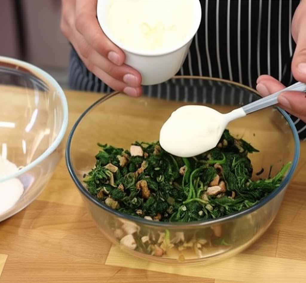 Boczek i cebulę posiekaj w małą kosteczkę. Obsmaż na patelni, kiedy wytopi się tłuszcz wsyp cebulę. Razem smaż do zeszklenia cebuli. Dodaj szpinak, przypraw go delikatem warzywnym, gałką i ostrą papryką. Ostudź.