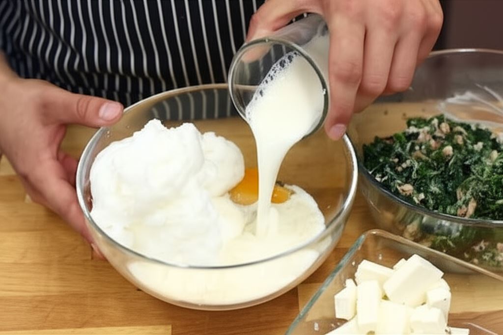 Rozdziel jaja. Białka ubij na sztywno. Połącz białko i żółtka z mąką i mlekiem, dodaj farsz szpinakowy i ser feta, całość delikatnie wymieszaj razem.