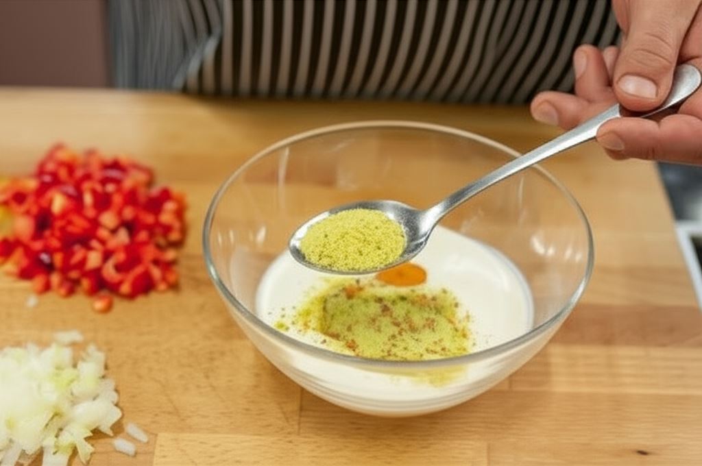 Cebulę i paprykę posiekaj w małą kostkę. Pietruszkę drobno pokrój, śmietanę połącz dokładnie z jajkami i przypraw do smaku Delikatem Knorr oraz pieprzem.