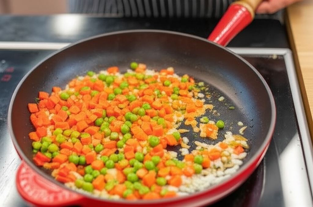 Na rozgrzanej patelni z oliwą zesmaż cebulę i paprykę. Dorzuć marchewkę z groszkiem, posiekaną natkę i podsmaż moment razem. Przełóż do miski i ostudź nieznacznie.
