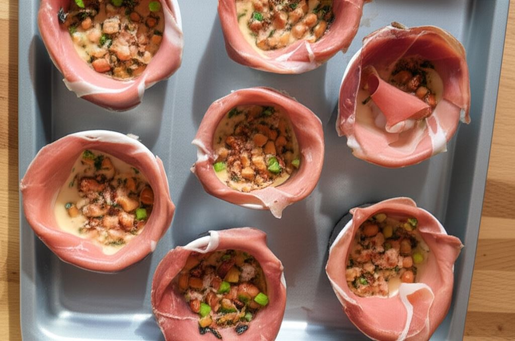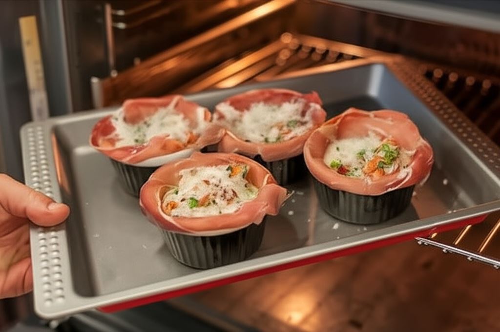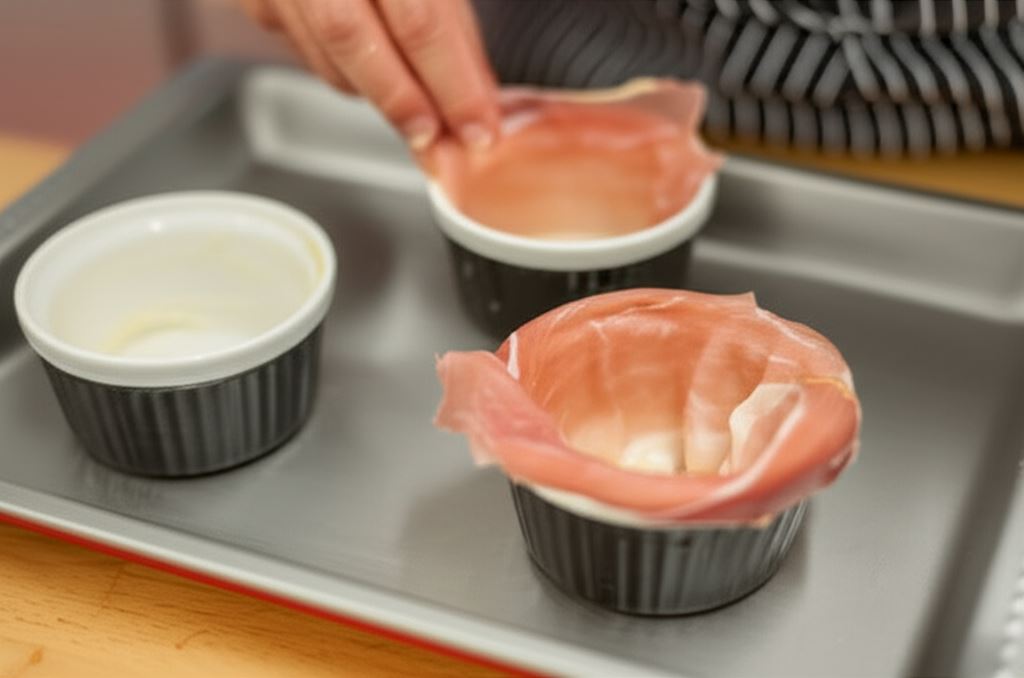 Wysmarowane foremki muffinowe wyłóż plasterkami szynki – po 2 plastry na każdą foremkę i umieść na blasze do pieczenia.
