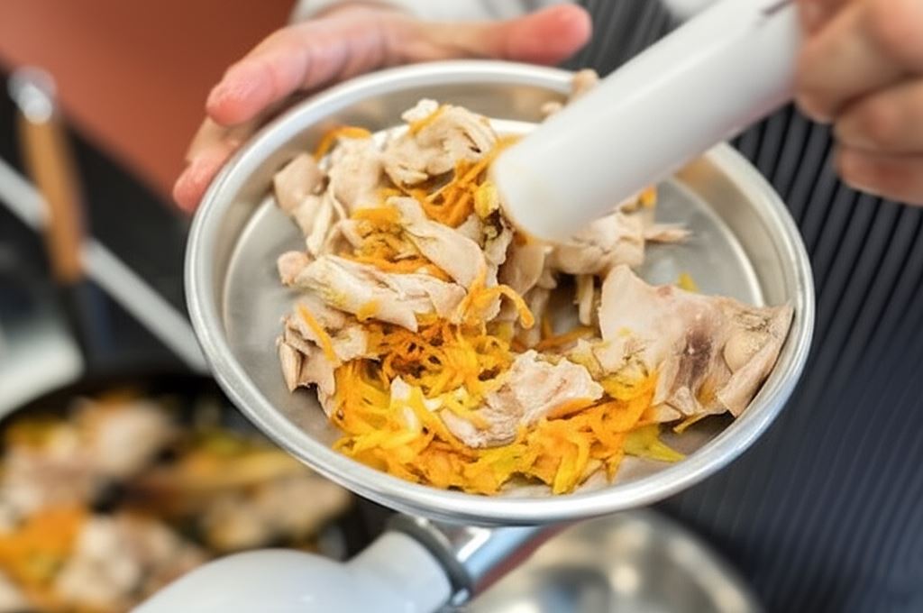 Z udek przygotuj rosół albo inną zupę. Ugotowane mięso oddziel od kości. Muszle makaronowe blanszuj przez 4 minuty w gotującej się wodzie, odcedź, przepłucz zimną wodą, odstaw na bok.
