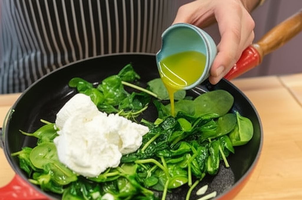 Na następnych dwóch łyżkach oliwy, na patelni po usmażeniu cebuli, podsmażaj szpinak. Kiedy zmięknie, połącz go z serem ricottą i żółtkiem jajka. Przypraw według smaku.