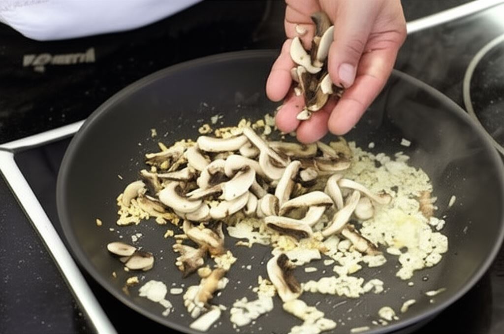 Na oleju w rondlu zrumień posiekaną cebulę z czosnkiem. Następnie wsyp pokrojone w plastry pieczarki i smaż całość aż do odparowania płynu.