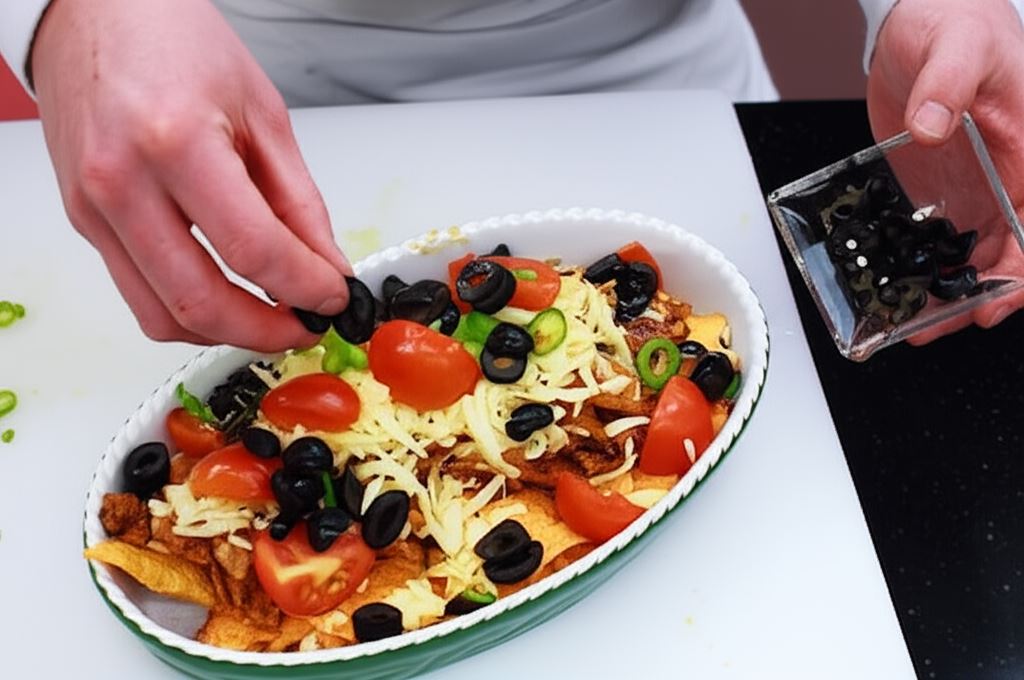 Obsyp je od góry przyrumienioną wołowiną, serem żółtym, pomidorami, chili papryką oraz oliwkami czarnymi.