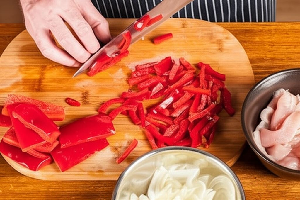 Kurczaka potnij na cienkie paski, cebulę pokrój w piórka. Paprykę oczyść z nasion i pokrój w cienkie paski.