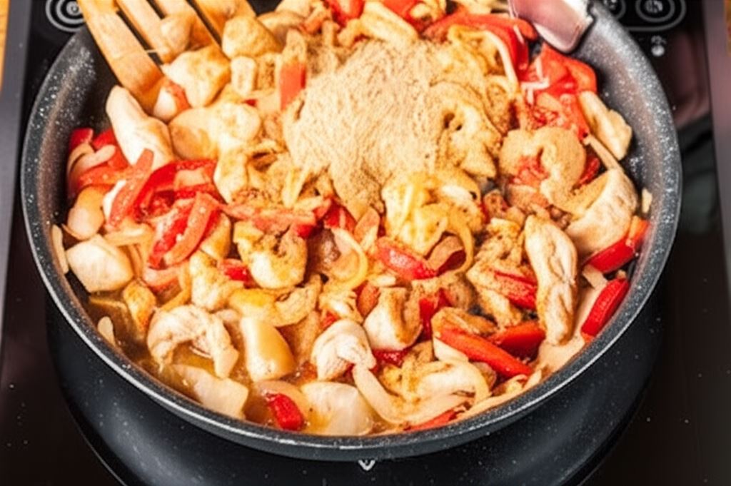 Na patelni zrumień cebule, wsyp paprykę i kurczaka, smaż 5 min, zalej wodą i wsyp Knorr Fix. Gotuj przez następne 5 min.