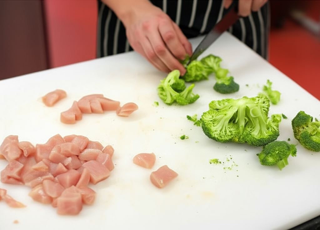 Kurczaka potnij w kostkę, przypraw solą i pieprzem. Brokuł podziel na różyczki i ugotuj.