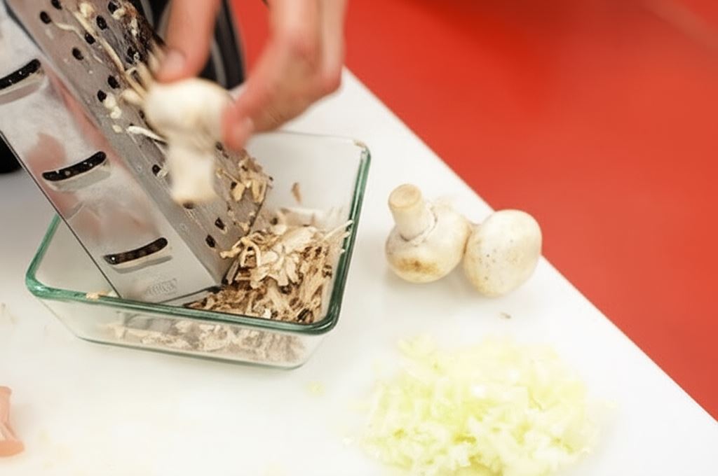 Pieczarki opłucz i zetrzyj na tarce o dużych oczkach. Cebulę drobno posiekaj.