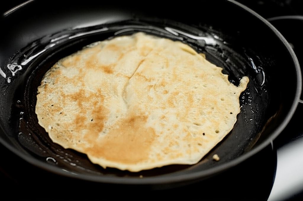 Patelnię delikatnie natłuść i odczekaj, aż się nagrzeje. Potem smaż naleśniki wylewając na patelnię cienką warstwę ciasta. Każdy naleśnik usmaż z obu stron.