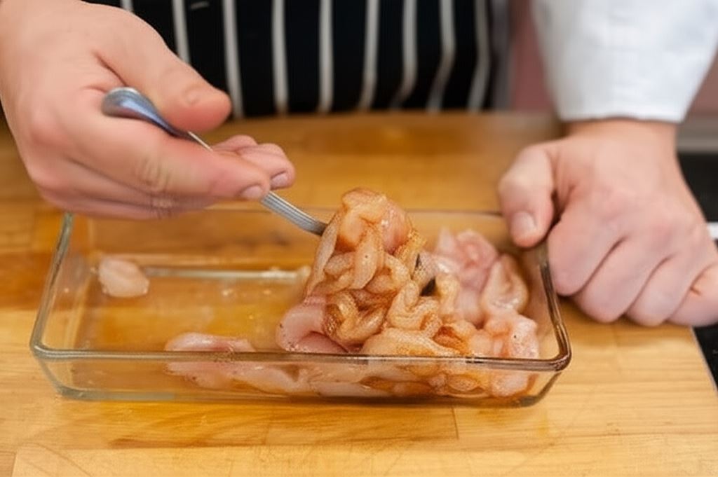 Mięso potnij w paski, pieczarki w plasterki. Przyprawę Knorr połącz z olejem i natrzyj tym mięso. Kurczaka oraz pieczarki przysmaż na patelni i ostudź.