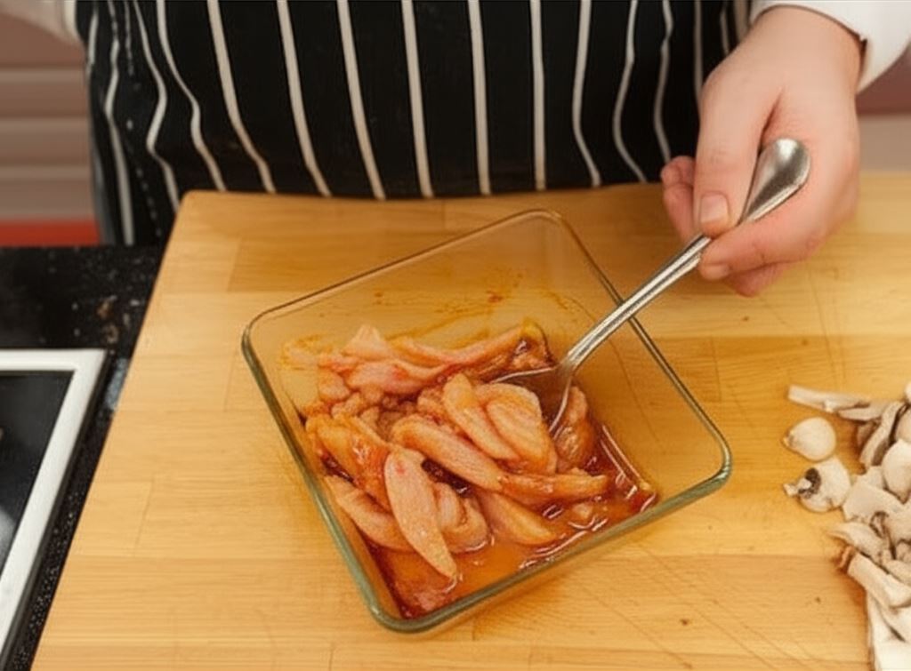 Mięso potnij w cienkie paski, a pieczarki w półplasterki. Przyprawę Knorr połącz z olejem i zamarynuj w niej mięso.
