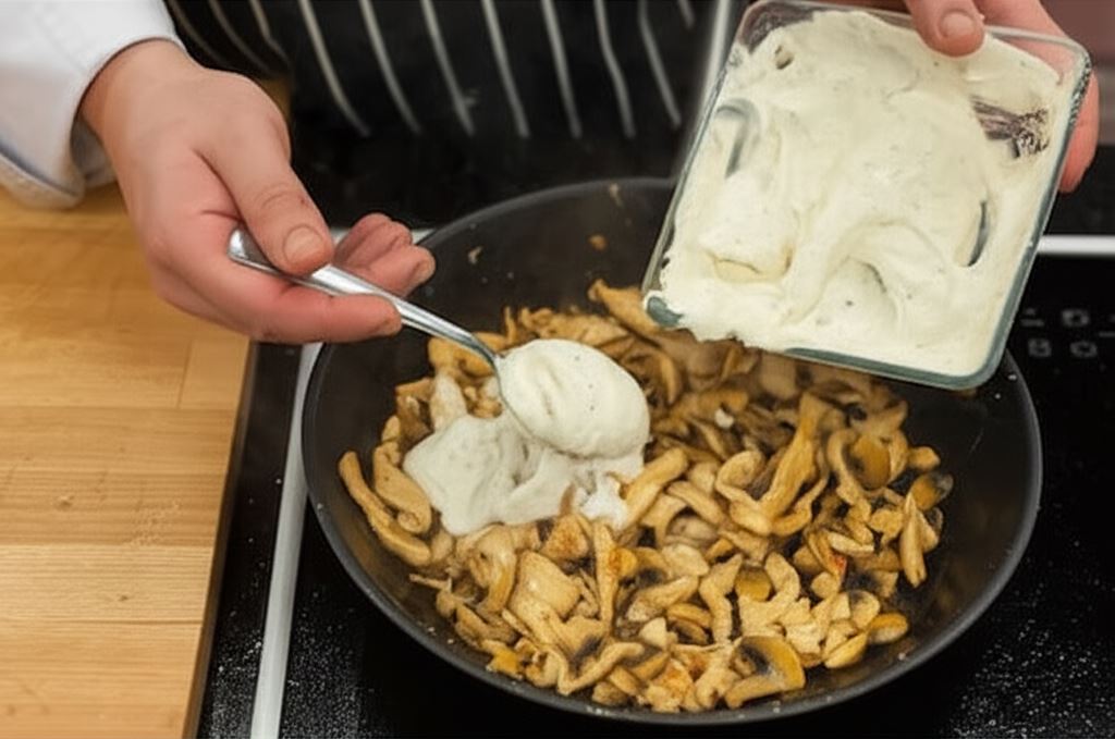 Mięso podsmaż na patelni, wsyp pieczarki, wszystko zalej Fixem połączonym ze śmietaną. Gotuj przez minutę, po czym całość pozostaw do wystudzenia.