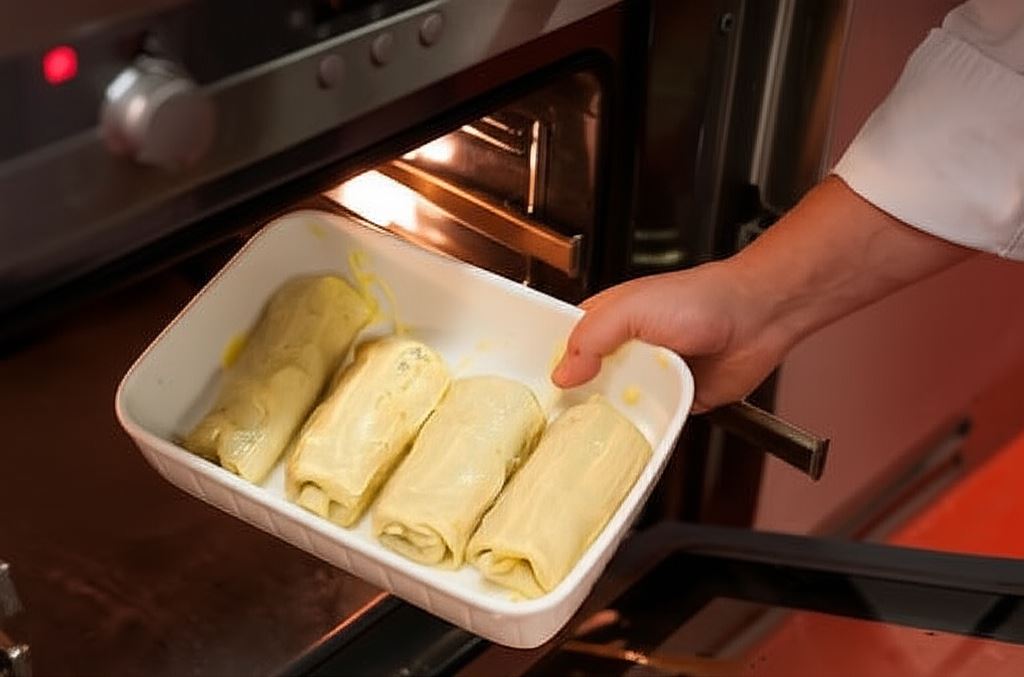 Przygotowane naleśniki umieść w naczyniu żaroodpornym. Zapiekaj przez 20 minut w temperaturze 180 °C.