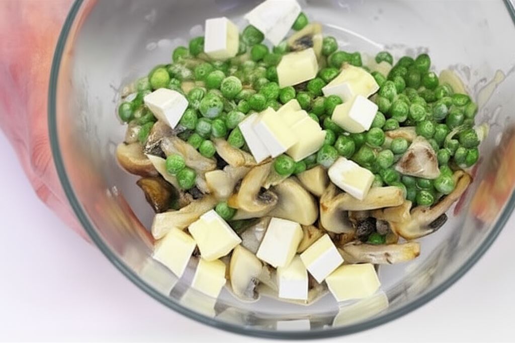 Pieczarki pokrój w ósemki, cebulę w piórka. Na rozgrzanej patelni zrumień pieczarki, potem dodaj pokrojoną cebulę oraz groszek. Wlej śmietanę, gotuj moment, a następnie przypraw solą i pieprzem – kiedy farsz przestygnie trochę, dodaj pokrojony w kostkę ser i wymieszaj.
