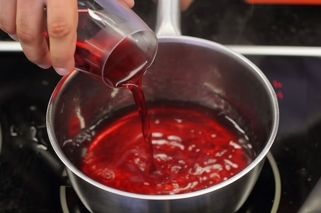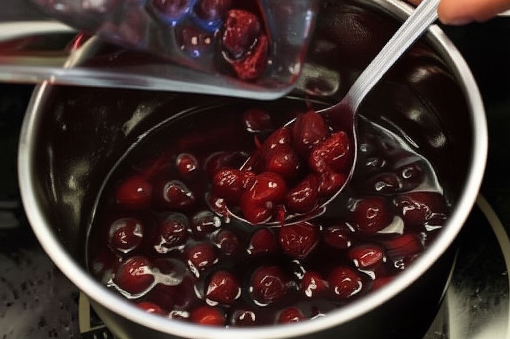 Skrobię ziemniaczaną rozmieszaj w niewielkiej ilości zimnej wody, po czym zagęść tą mieszanką wrzące wino. Kiedy wino osiągnie konsystencję sosu, wsyp wiśnie, doprowadź do wrzenia i odsuń z palnika. Wiśnie wyciągnij z sosu przy pomocy łyżki cedzakowej.