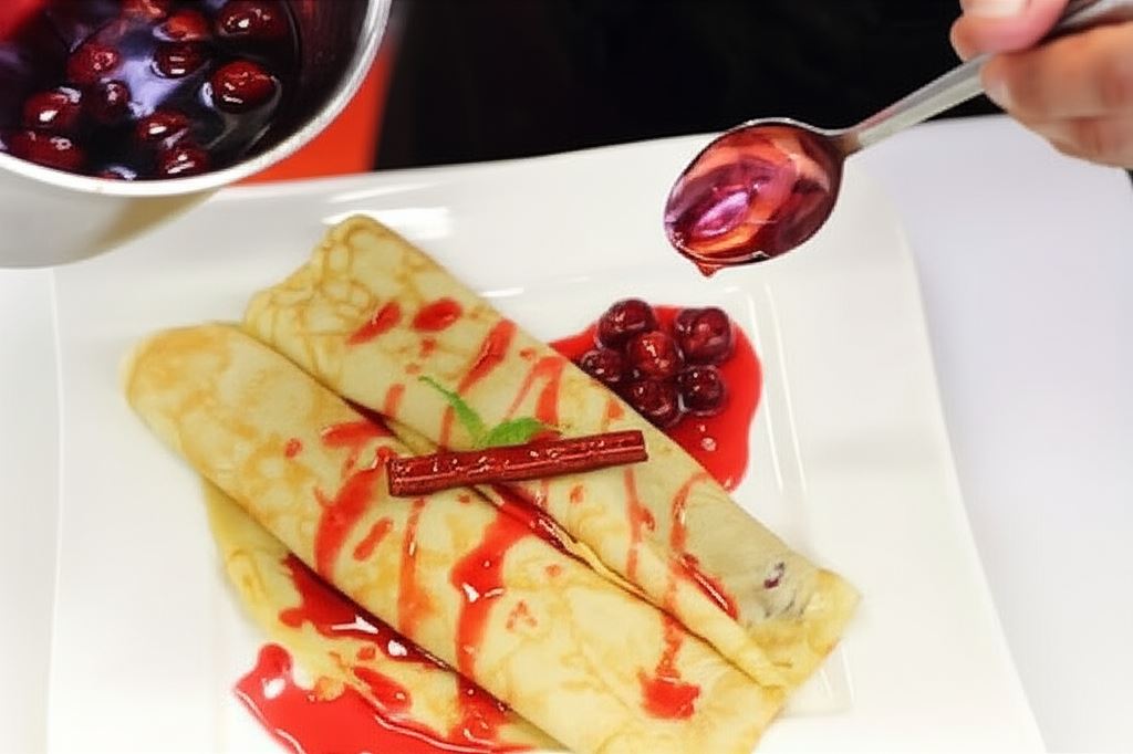 Delikatne naleśniki otulające soczyste wiśnie, skąpane w aromatycznym sosie winno-cynamonowym to prawdziwa uczta dla podniebienia. Klasyczny przepis w eleganckiej odsłonie, gdzie słodko-kwaśne wiśnie spotykają się z głębią czerwonego wina i ciepłem cynamonu. Każdy kęs to harmonia smaków, która rozpływa się w ustach, pozostawiając przyjemne wspomnienie.