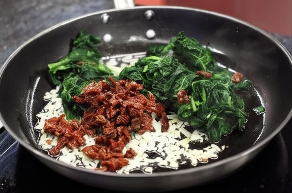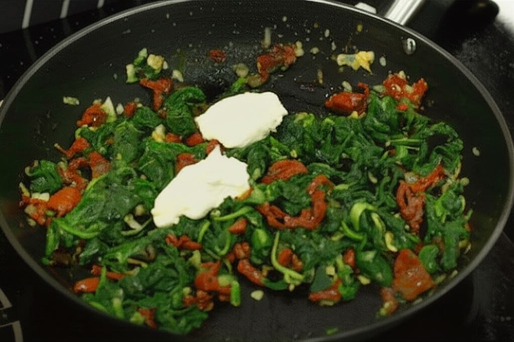 Szpinak odmroź i wyciśnij, aby usunąć nadmiar wody. Cebulę posiekaj w kostkę, zrumień, dorzuć szpinak i pokrojone w kostkę suszone pomidory.