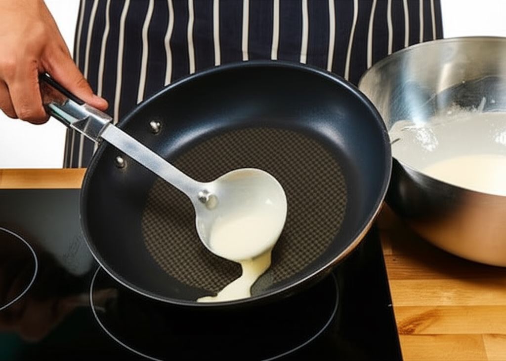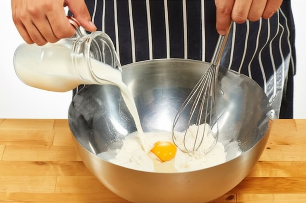 Sporządź ciasto naleśnikowe – połącz dokładnie mleko, delikatnie ubite jajko i mąkę.
