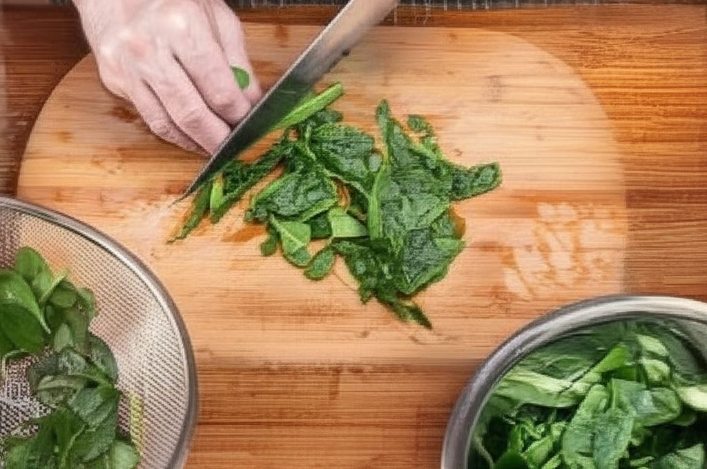 Oczyszczony i starannie opłukany szpinak wrzuć na minutę do posolonego wrzątku, następnie przełóż do durszlaka i odcedź. Potem posiekaj, ale niezbyt drobno.