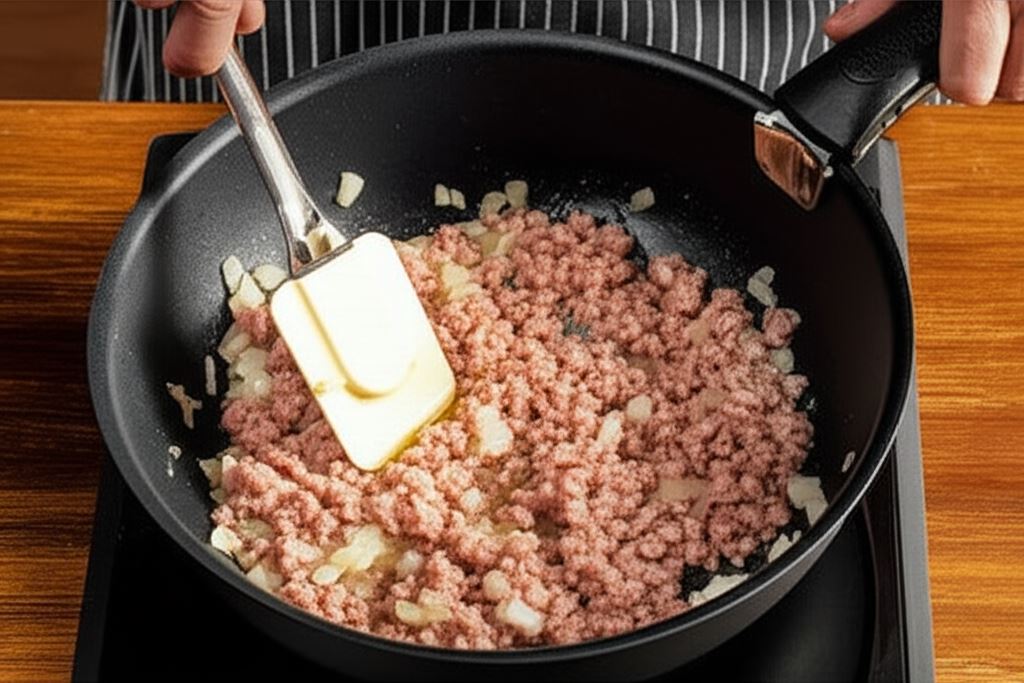 W rondlu podgrzej olej. Zrumień pokrojoną w kostkę cebulę, po czym wsyp mięso mielone. Przypraw przyprawą do mięs, solą i pieprzem a potem smaż, aż mięso przestanie być surowe.